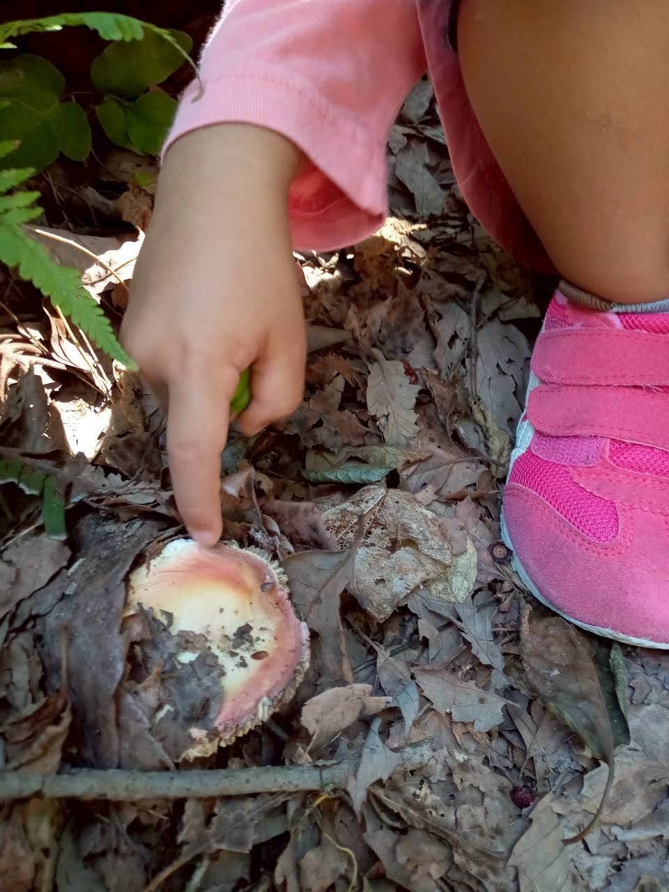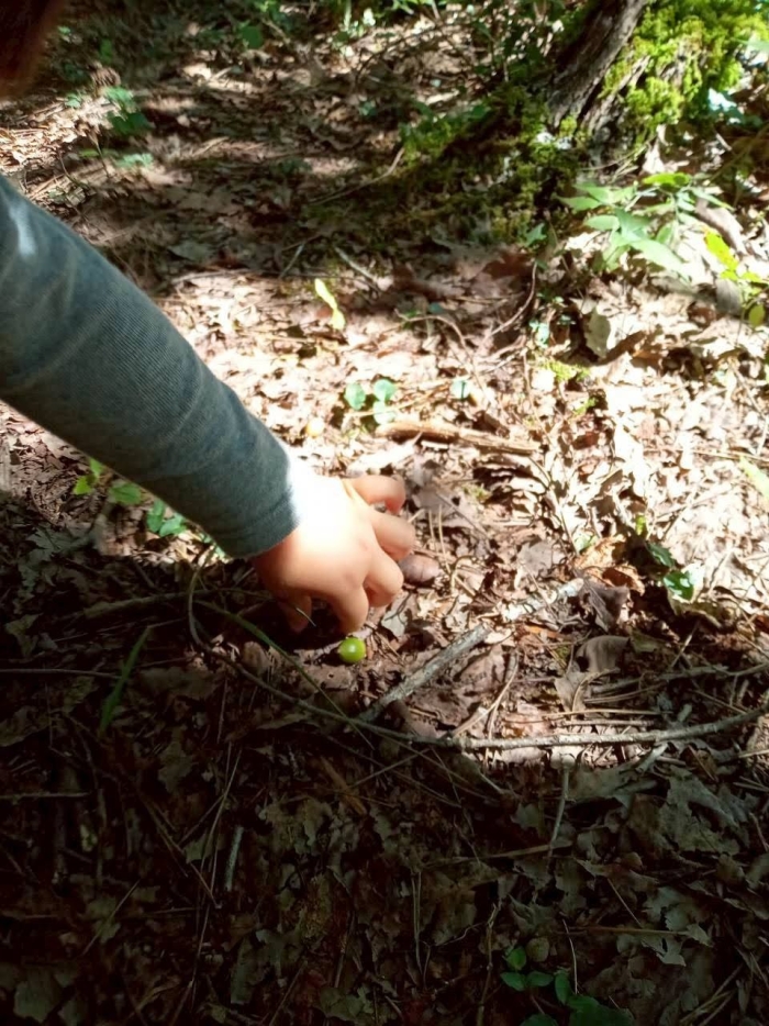まだ青いどんぐり、きのこ、大きなクモの巣。