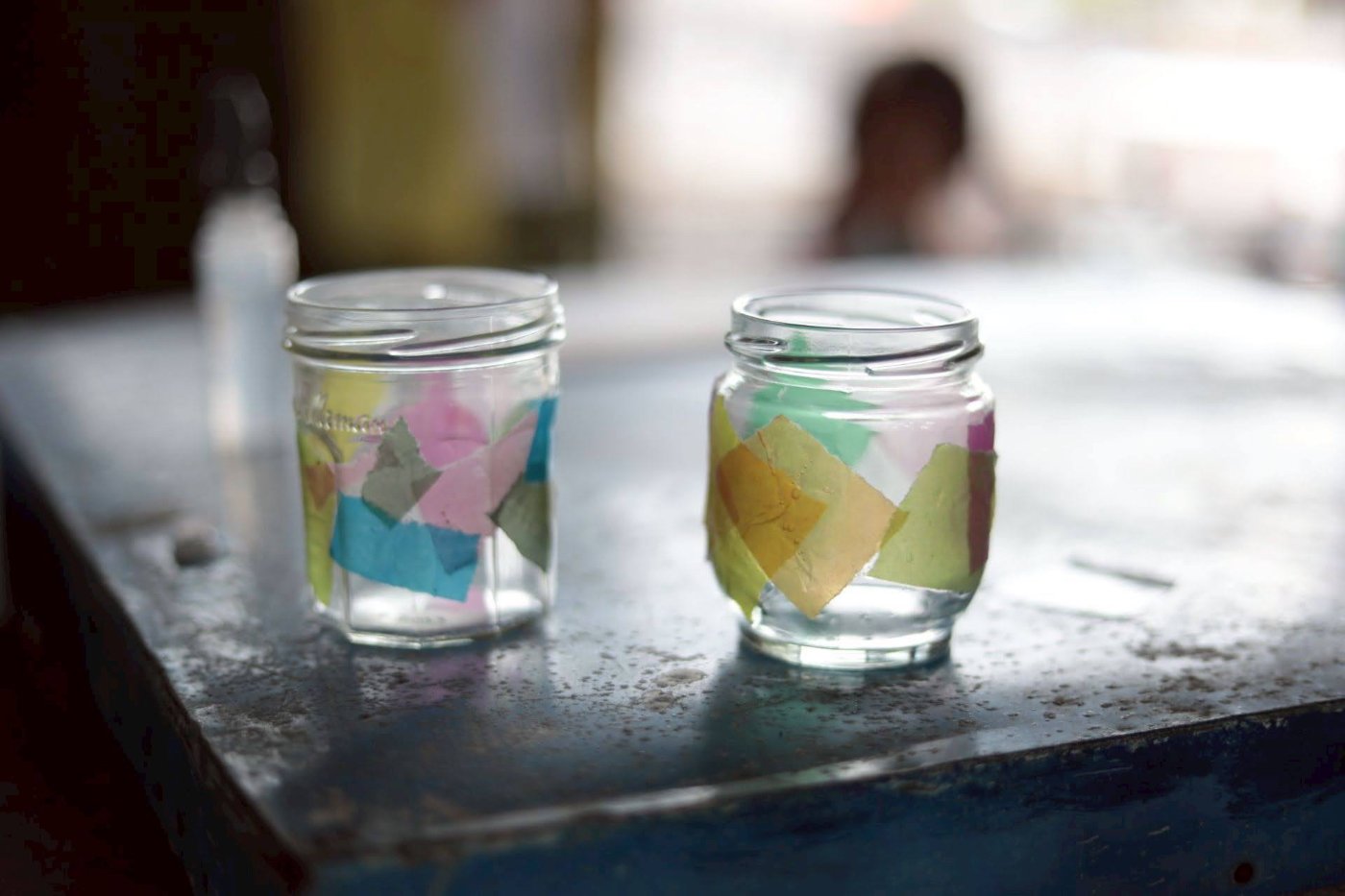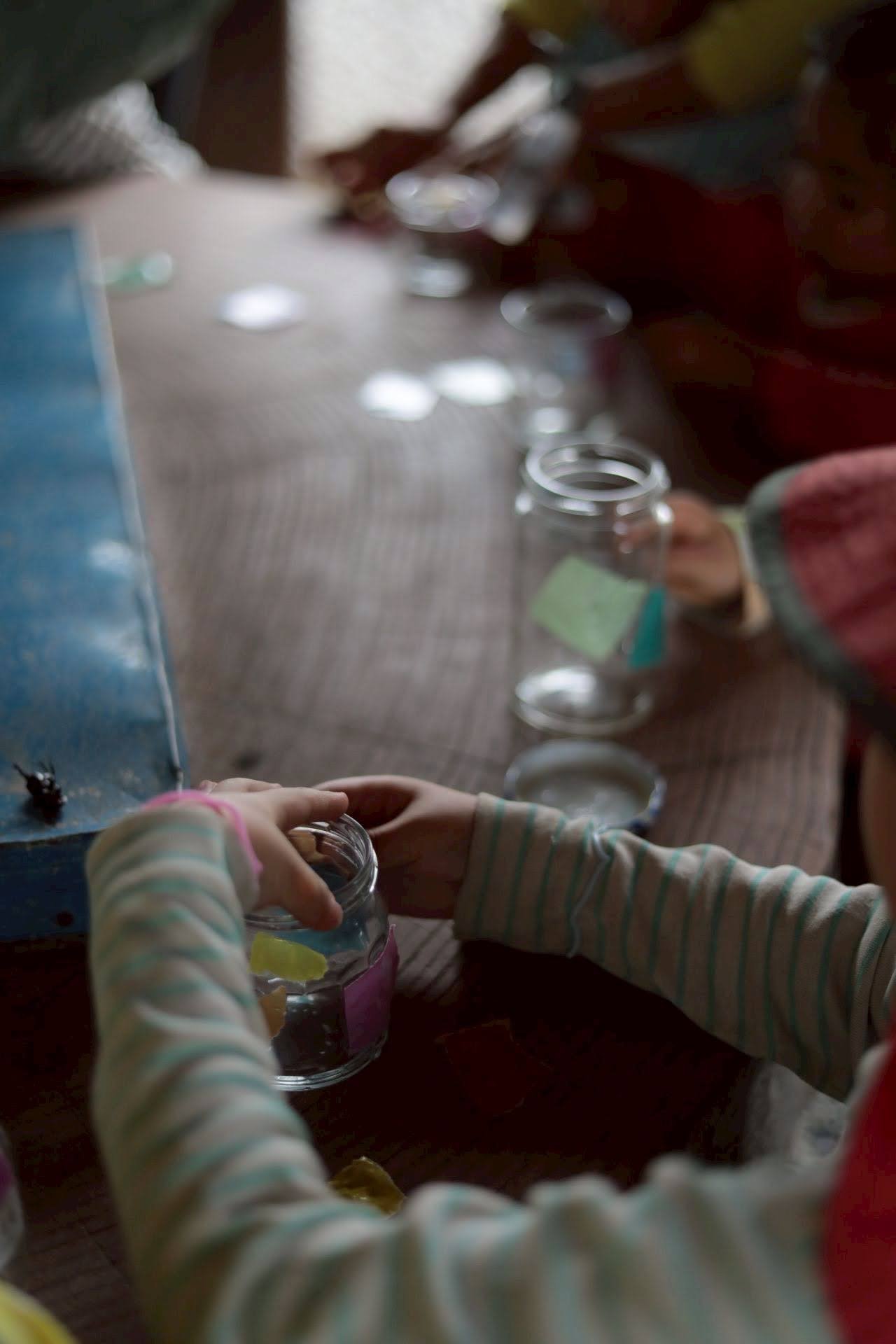 空き瓶に紙を貼り付けていく、小さい子でも簡単な作業。