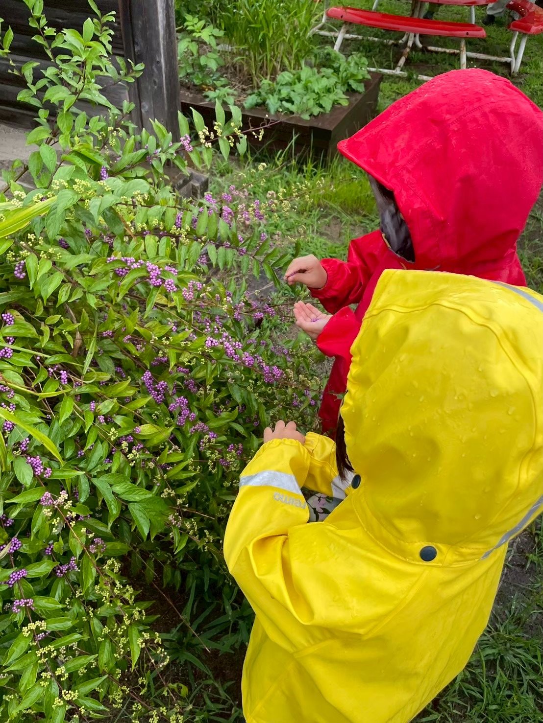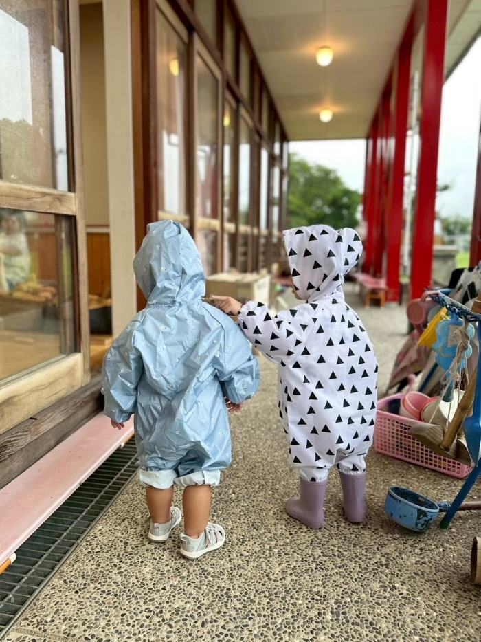 しばらくすると雨が小降りになり、小人さんたちは待ちきれない様子で園庭へ。合羽を着てトコトコ歩く小さな子の姿がとても可愛らしく、見ているだけで心が和みます。