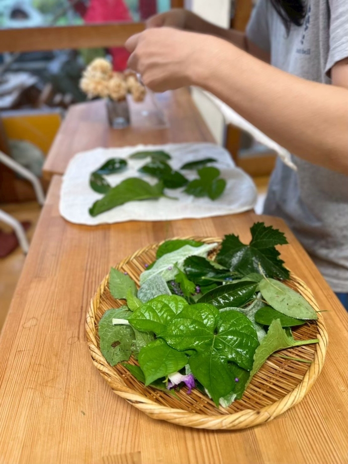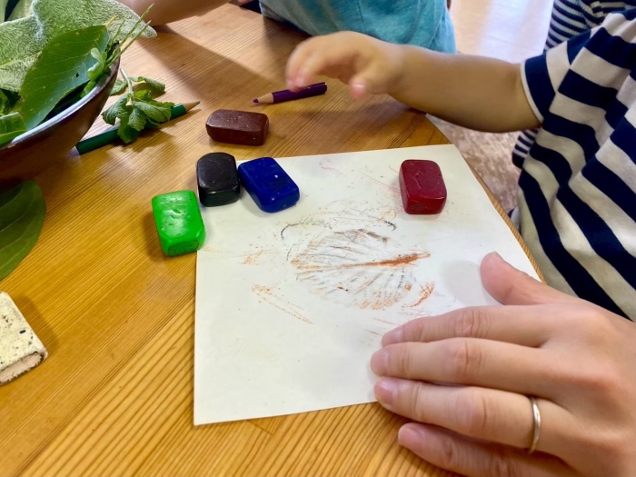 室内に戻ってからは、お散歩で集めた葉っぱを使った擦り出し遊び。クレヨンや色鉛筆で紙の上をなぞると葉脈の模様が浮かび上がります。雨の中採ったばかりの葉っぱは水分で紙を破いてしまうこともあってなかなか難しいのですが、裏側にしてブロッククレヨンを使うととてもきれいに形が出ることに気づいた子も。好きな葉っぱと色を選びながら、それぞれ夢中で作品を仕上げていました。