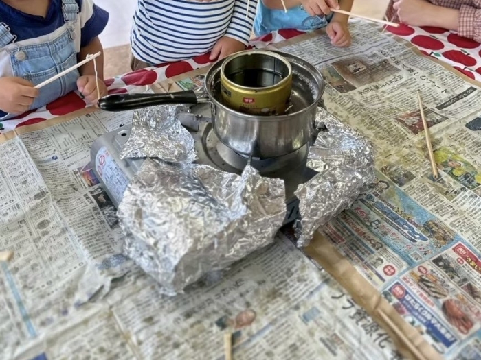 午後は自由遊びの合間に、希望した子どもたちがお誕生日のキャンドルづくりに挑戦。ロウを少しずつ重ねて太くしていく作業は根気が必要で、ロウが溶けないようにコツコツと積み上げていく子どもたちの真剣な眼差しがとても印象的でした。