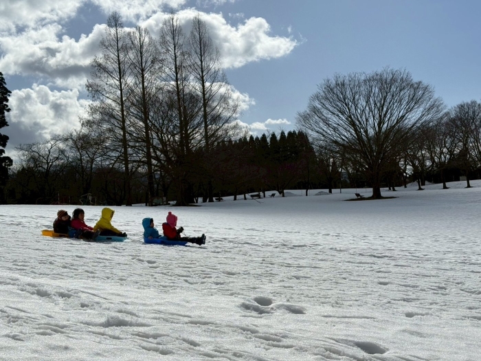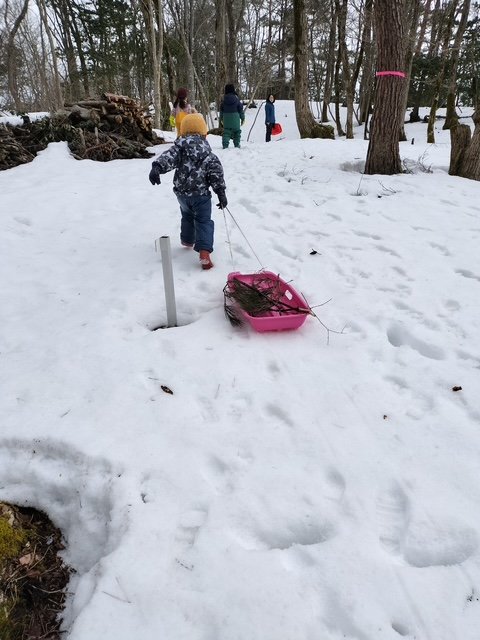 午後からは、みんな大好きなソリ滑り。何度も何度も坂をすべって大笑い。