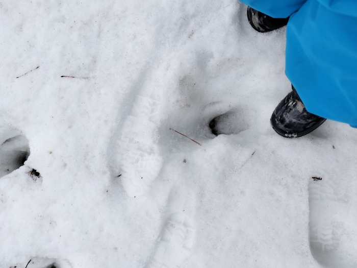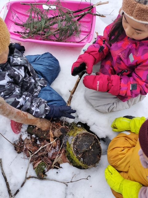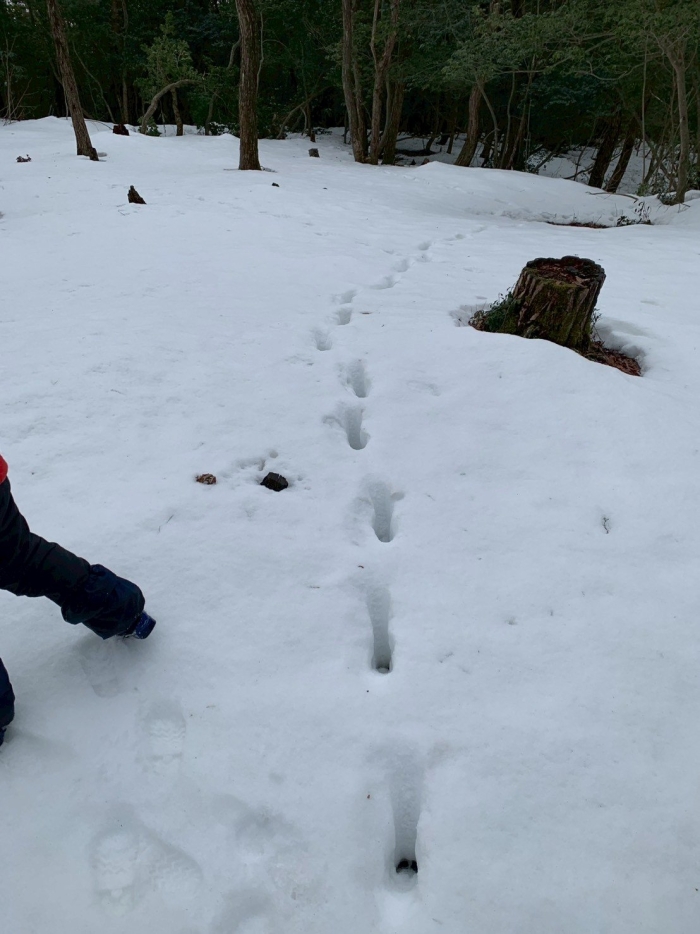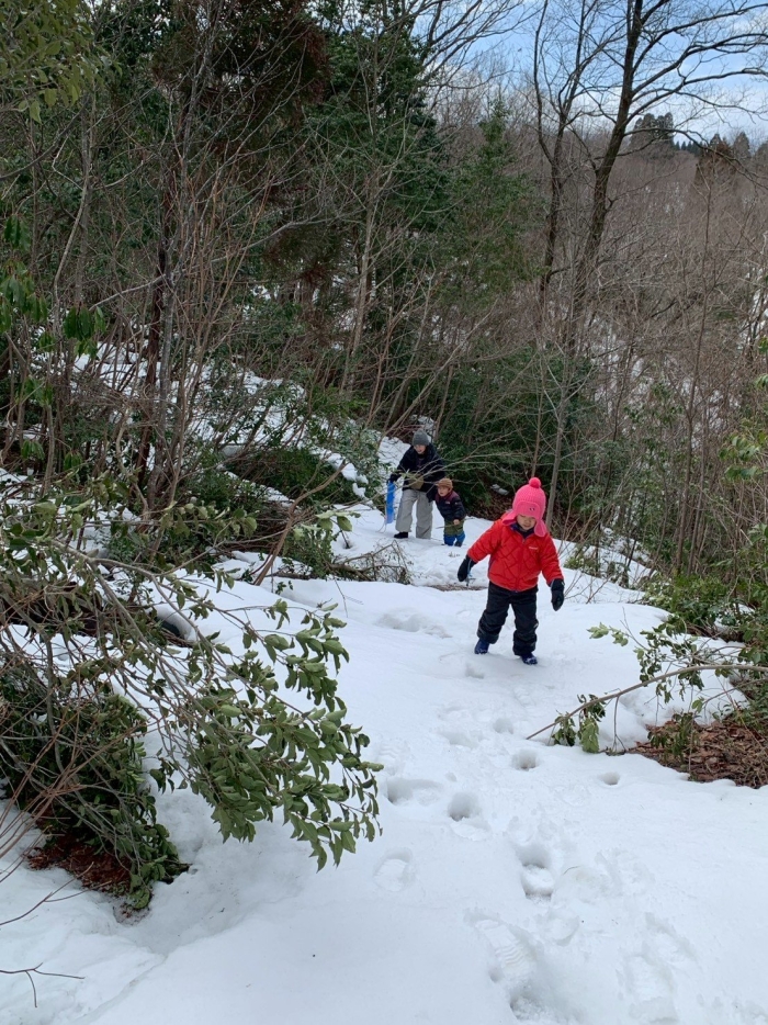 カモシカの足跡を見つけたり、冷たい空気を感じたり、キノコを見つけたり、雪道も子供達の目もキラキラ。どこからか「大発見だよー」と子供の声が聞こえてくる。毎回来る度に違う顔を見せてくれる森は小さな発見がいっぱいです。