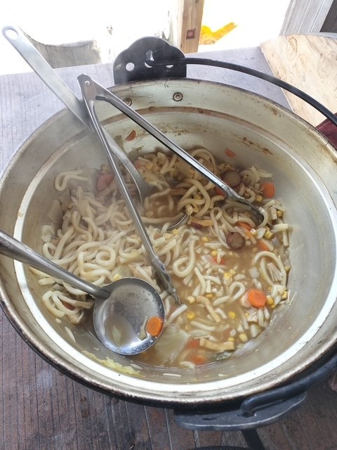 お昼は囲炉裏に集まってカレー鍋にうどんを入れて食べました。