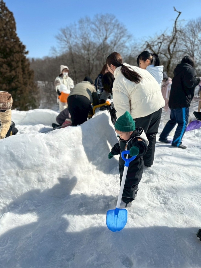ちびっこ組も小さなシャベルで雪をすくいお手伝い。真剣な眼差しが微笑ましい。