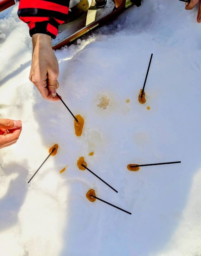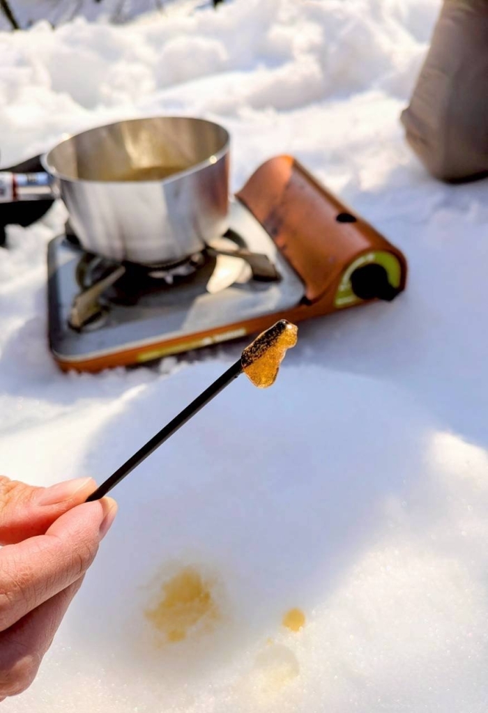 イグルーづくりの横では、お鍋で温めたメープルシロップを雪の上へ。