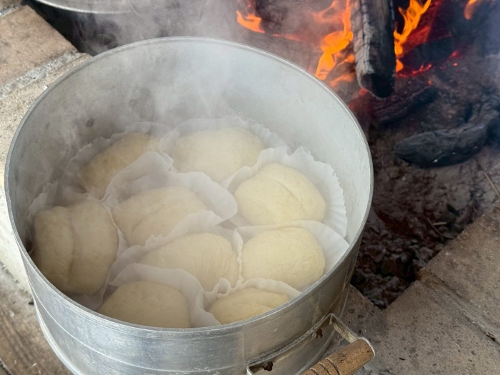 花巻きを開いて好きな具をはさんで、思いきり頬張る子どもたち。