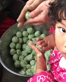 ヨモギと豆腐をお粉に混ぜます。みんなでお手伝い。