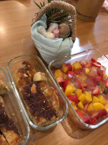 朝のおやつは、バナナケーキと、フルーツのゼリー寄せ。