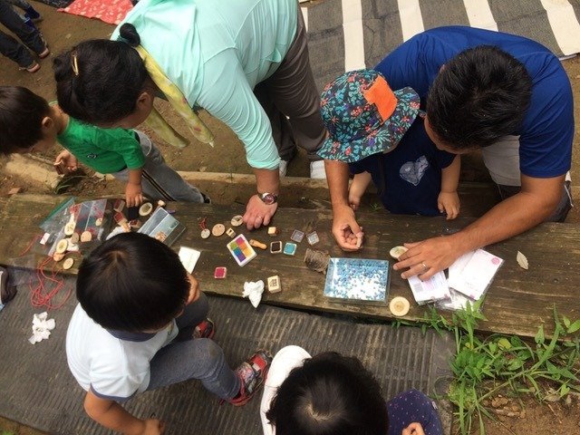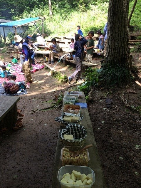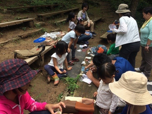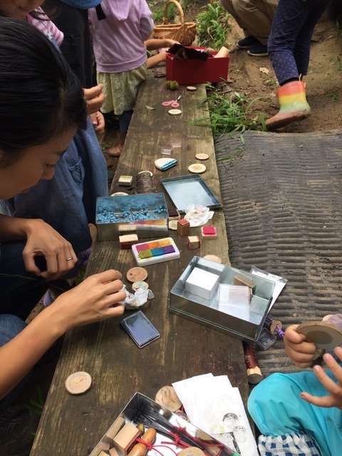 2019年09月12日(木) 森のようちえん 木のネームプレート作り 今回の森は、炭焼き小屋で木のネームプレート作りです。 みんなで挨拶をしたあと、思い思いに進みます。 一歳児さんたちは、初めてのどんぐりシーズンに大興奮! 木のネームプレート作り。 好きな木を選んで いろんな色でスタンプ押して 大人も子どもも夢中で作りました。 お昼ご飯はポットラック。 みんなモリモリ食べたよ。 絵本を読んでお別れです。 また森で会いましょう。 (Rちゃんかあさん)