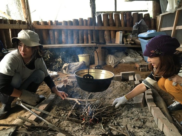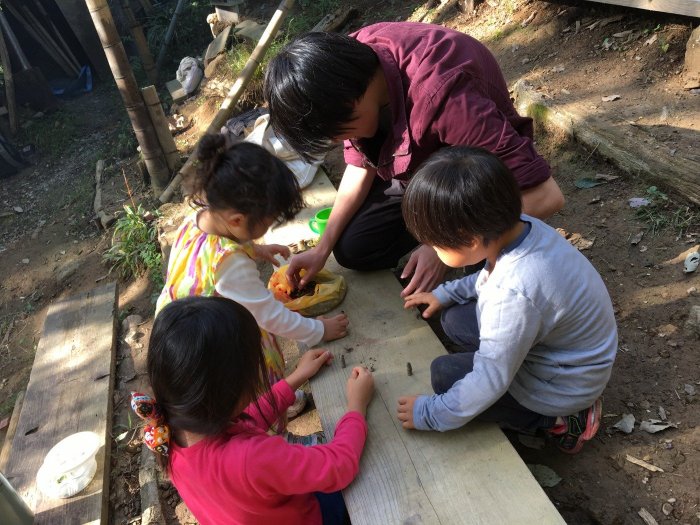 子供たちは、鉄の櫛のようなものを使って、モミをこそげおとします。