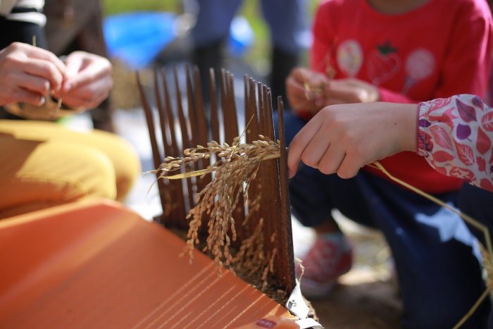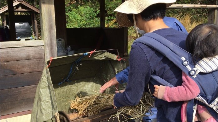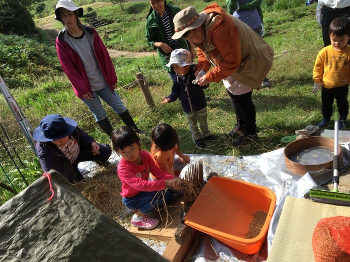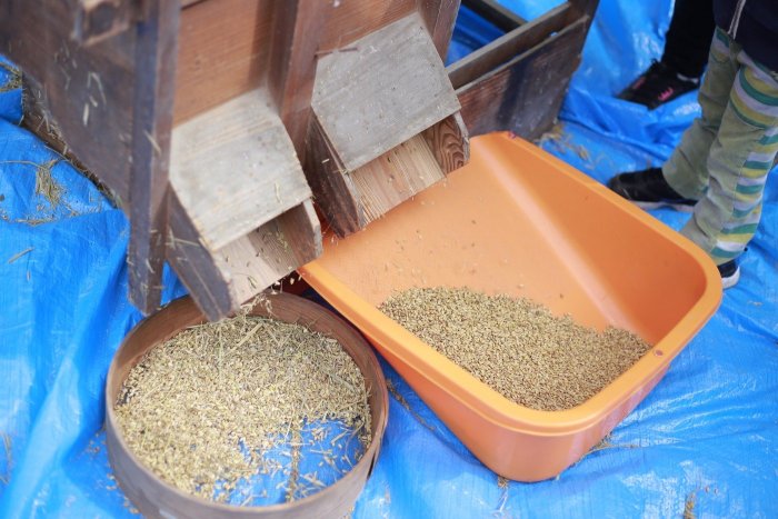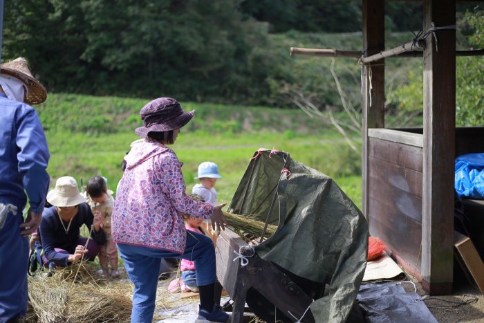 大人は足踏み脱穀機で。しっかり持っていないと全部持っていかれてしまうので、結構大変でした。