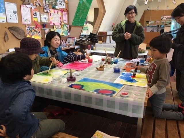 かおり先生から、にじみ絵は過程がとても大切なこと、子どもたちはその過程の中で、筆の運び方や、筆の水分量、色の混ざり方など、経験しながら学んでいるということを教わりました。
