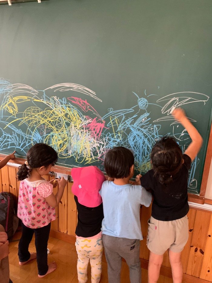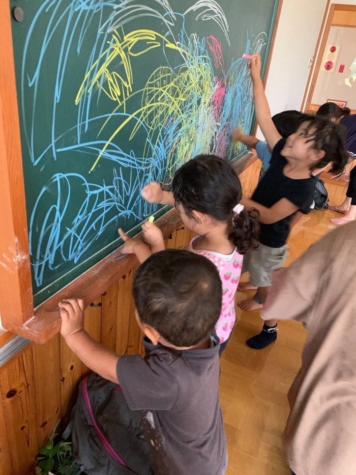 屋根の下に移動して、幼稚園の黒板で思いっきりお絵描き