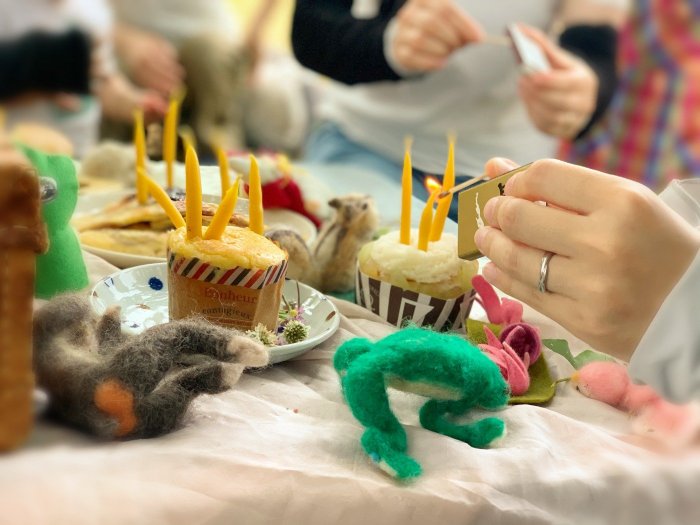 可愛いケーキにみんなで手作りしたミツロウのロウソクに、火をつけて