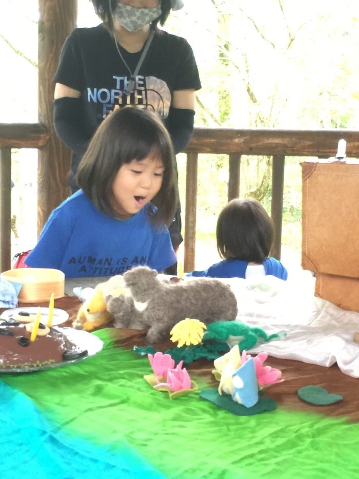 芝生でおやつのドライアップルを食べたあとは、お友だちのお誕生日をお祝いしました。