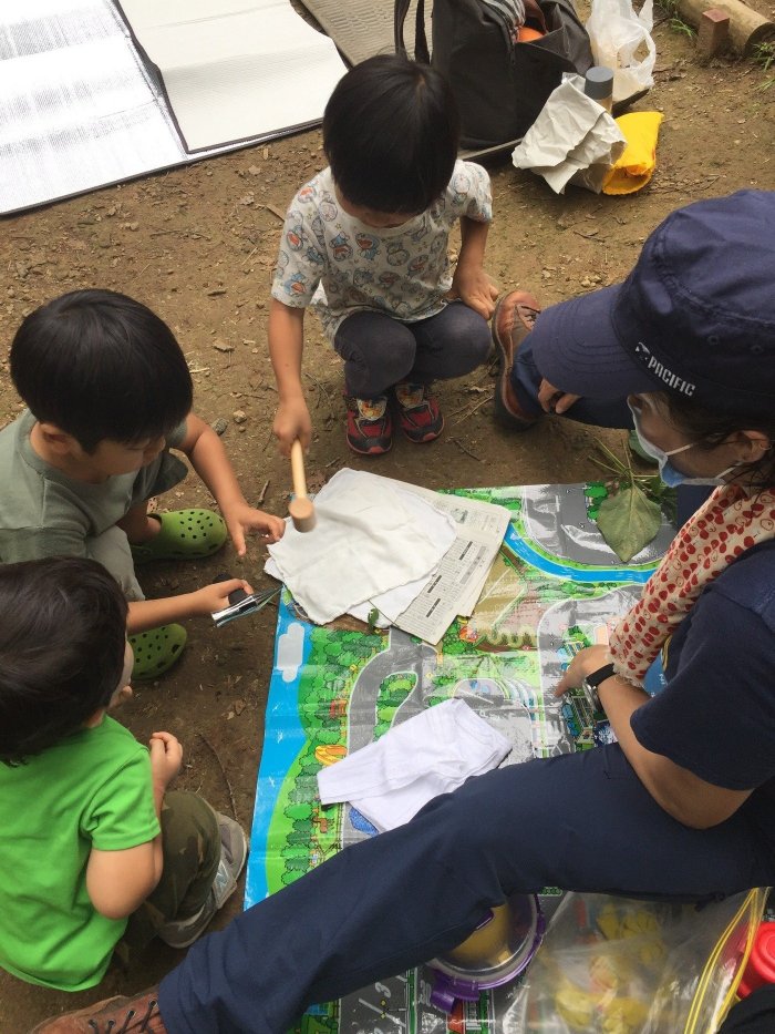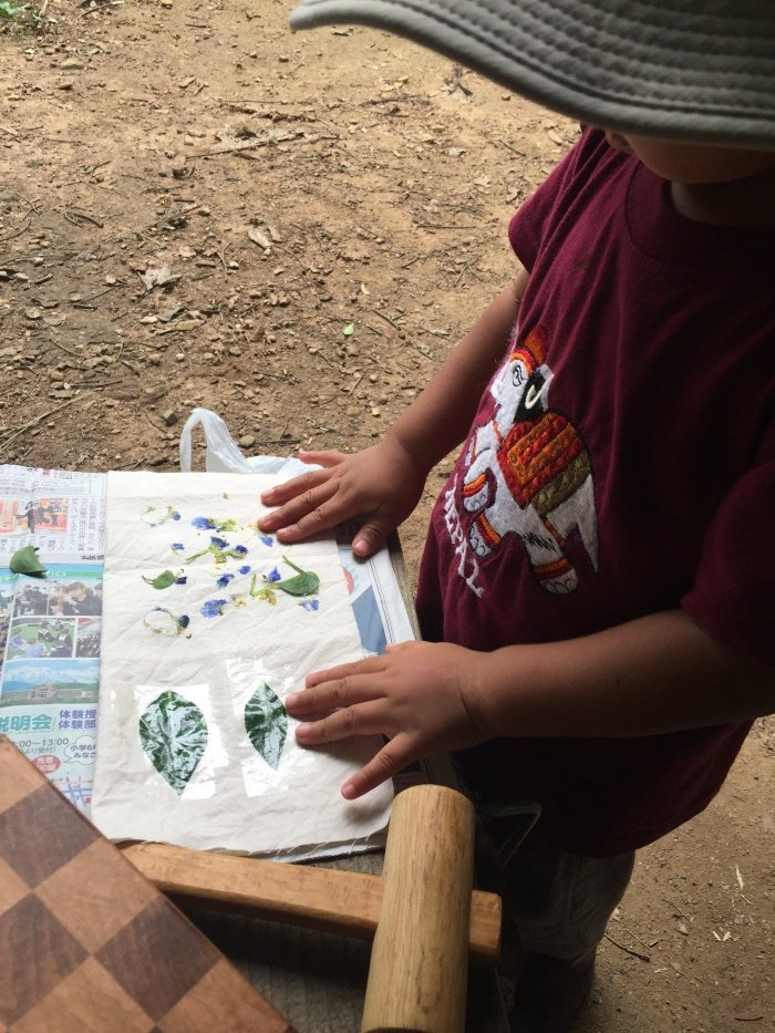 藍やつゆ草など、いろいろな葉っぱやお花を布に置いてトントントントン・・森に楽しい音が響きわたりました。