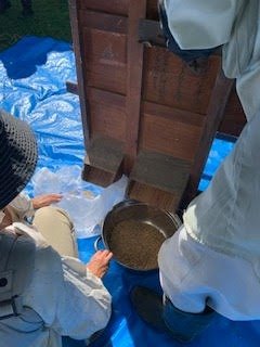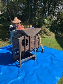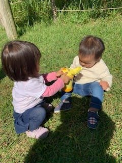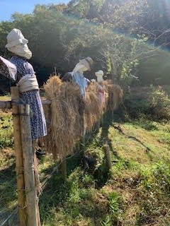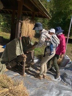 2020年10月21日(水) フォトギャラリー < 森のようちえん もち米を脱穀しました! 秋晴れの中、先日子どもたちと泥んこになって稲刈りした稲たちを脱穀しました。 脱穀とは乾燥させた稲の穂先から籾を落とす作業 かかしさんと共におひさまに気持ちよく干されていた稲たちを 昔ながらの脱穀機で 足踏みしながら 籾とワラにわけます。 こちらのワラは 年末のしめ縄作りに使わせていただきます 。稲って余すところがなくて凄いですね 。そして、森のこども園のお母さんが読んでくれた絵本で、一房の稲から2000粒もお米が取れると知りました。 この籾を更に唐箕(とうみ)という器具に入れて 人工的に風を起こし、籾や藁くずなどを重さごとに選別します。。。 これで籾を取り分けて、後は籾摺りして、ようやく玄米になります 。こんな工程を初めて実際に見てやってみて身体で知ることができて、先人の知恵に感謝しました。 今回の脱穀の参加者は可愛い1歳児の2人、 応援してくれてありがとう。 みんなで美味しいお餅を食べられるのが楽しみだね (MNちゃんかあさんより)