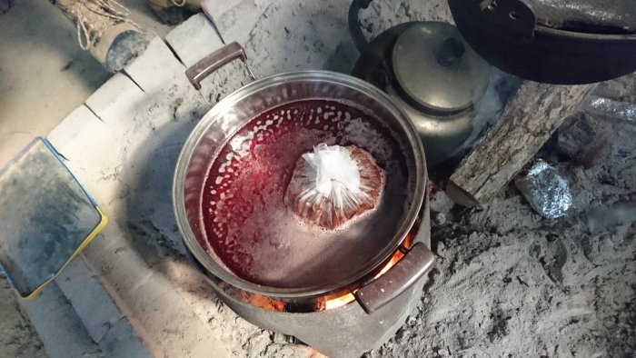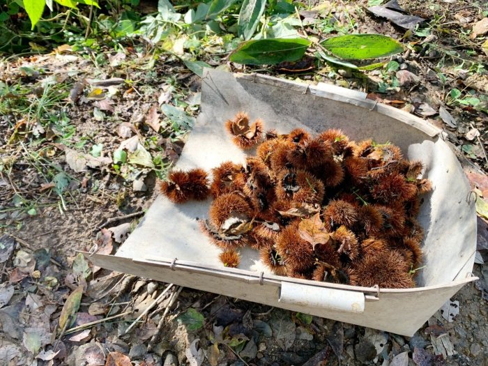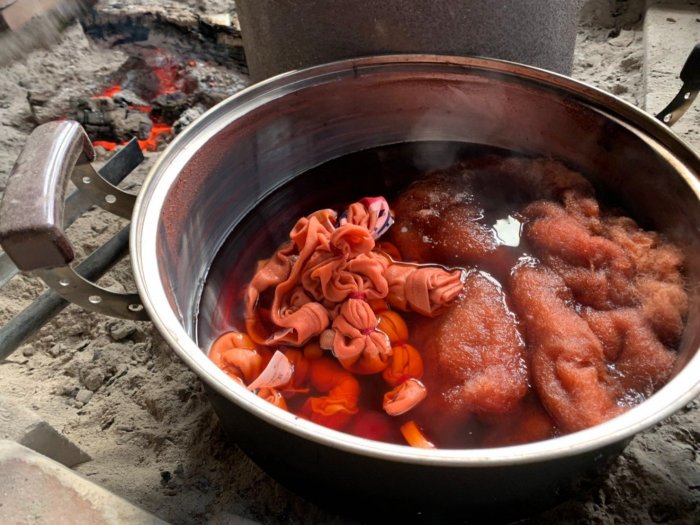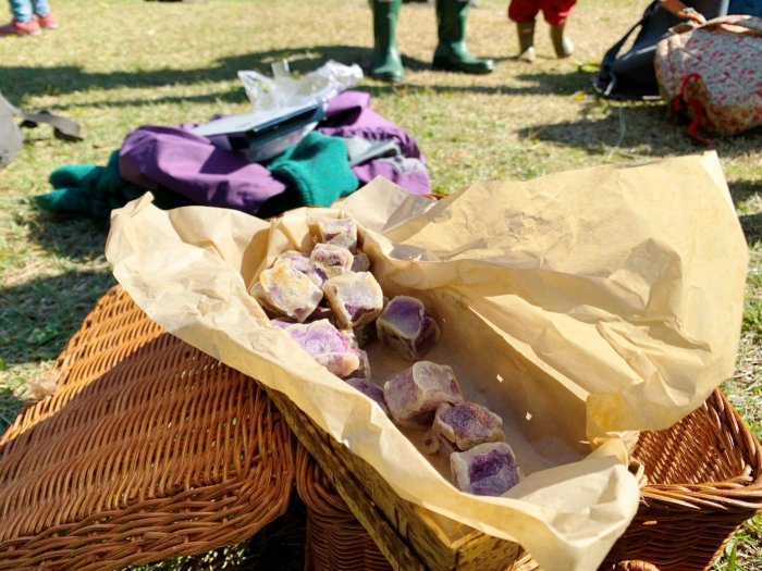 2020年11月05日(木) 森のようちえん 草木染め 今日の森。 ねいの里で見つけた、 栗のいがとあかねで、 草木染めを行いました。 クサギという、お花の青い実でも 染められるそうですが、 今年は、実があまりなく・・・。 またのお楽しみ。 まずは、美味しいおやつから。 おいものきんつば! こんなに素敵な仕上がりに。 (Kくんかあさんより)