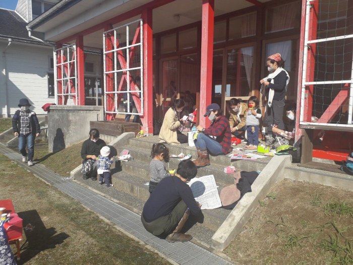森のおかあさんたち、青空のもと工作に熱中しています。獅子頭ができたら、早速手にもって思い思いに駆け回ります。