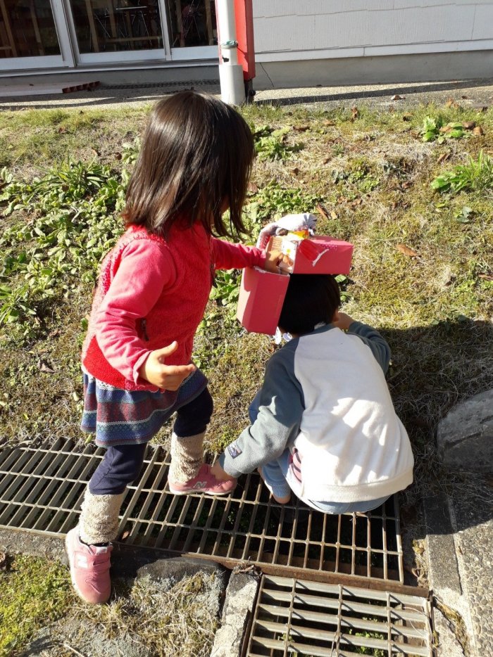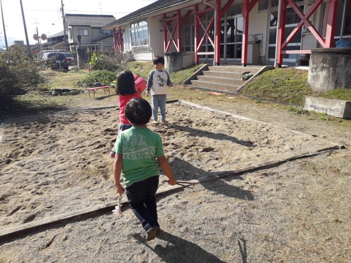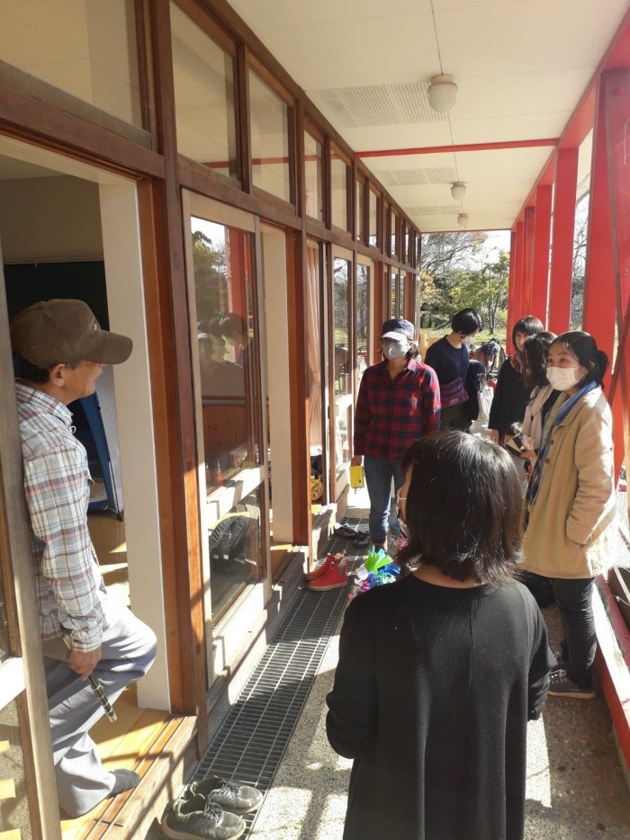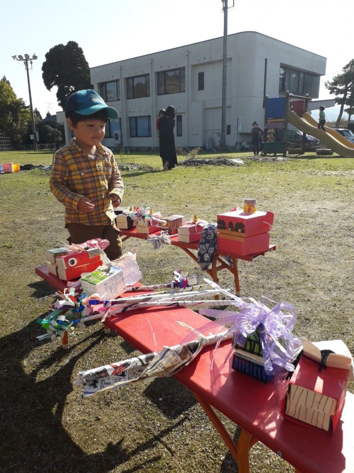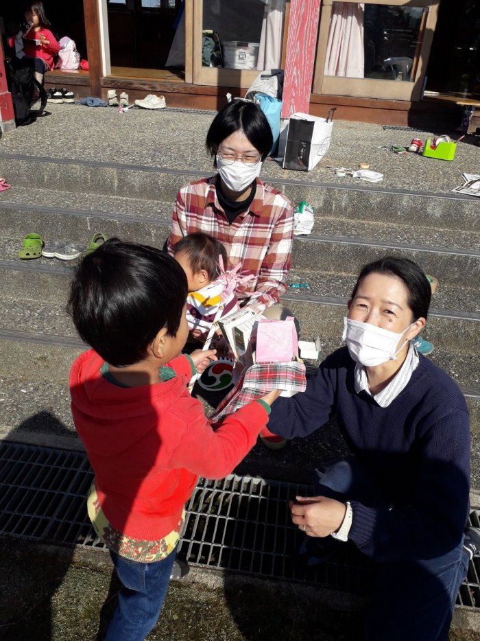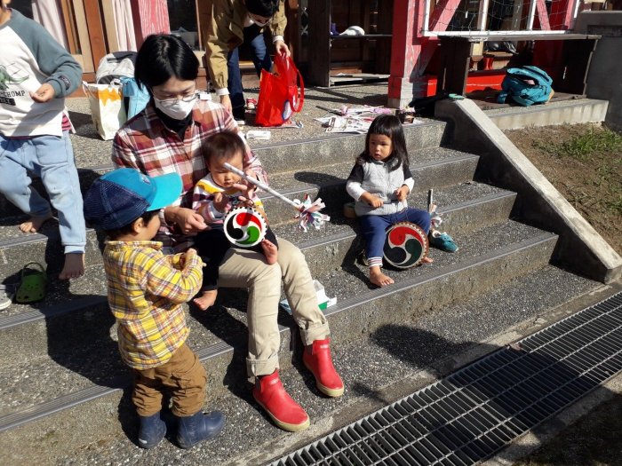 近くにお住まいの方が、獅子舞の笛を吹いてくださいました。笛の音が聞こえるだけで、急にお祭り気分が盛り上がるから不思議です。例年の秋祭りの様子や、地域の方がそこにかける思いなどを伺うことができました。来年は、森のようちえんの皆で、ぜひ秋祭りに遊びに行けるといいですね。
