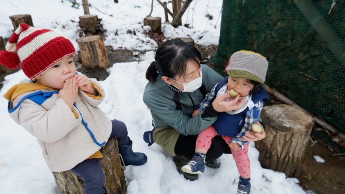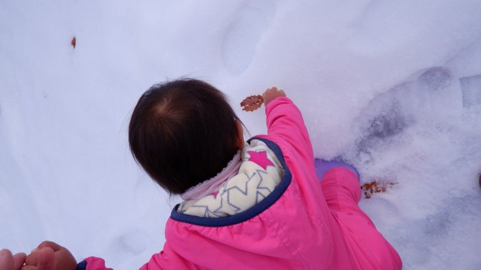 おやつを食べたら、こびとさんたちはさっそく雪遊び。