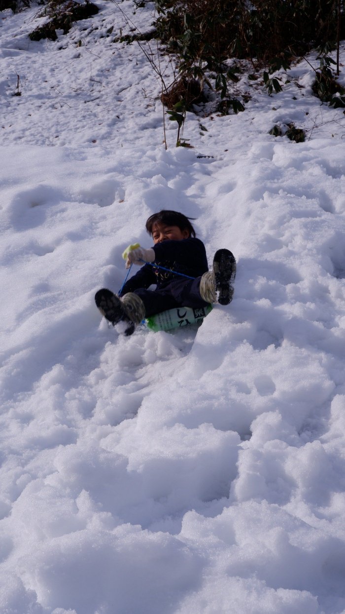 お米の袋で作ったそりで、どこでも滑ります。