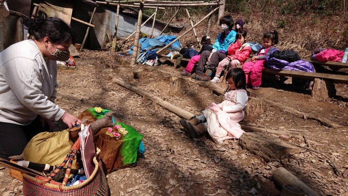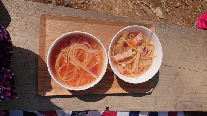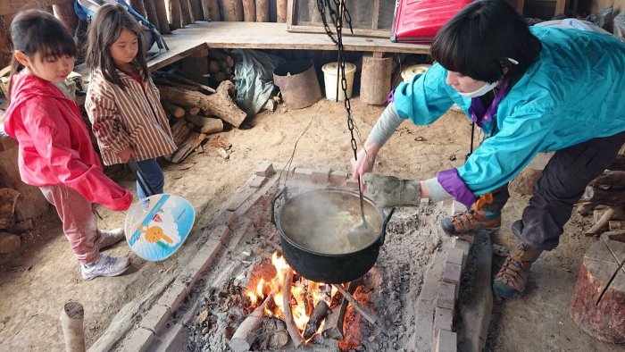 こびとさんも拾った松ぼっくりや薪をくべたり、団扇で扇いだりのお手伝い。