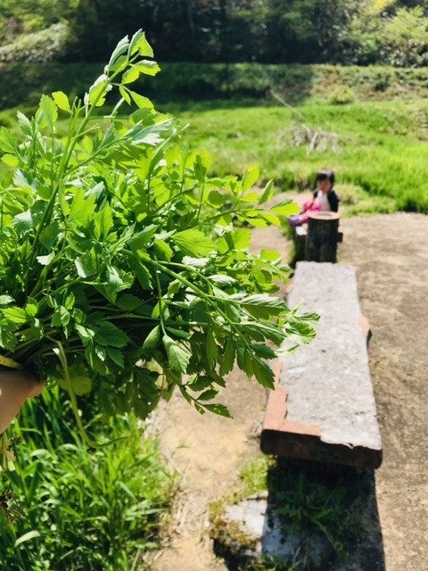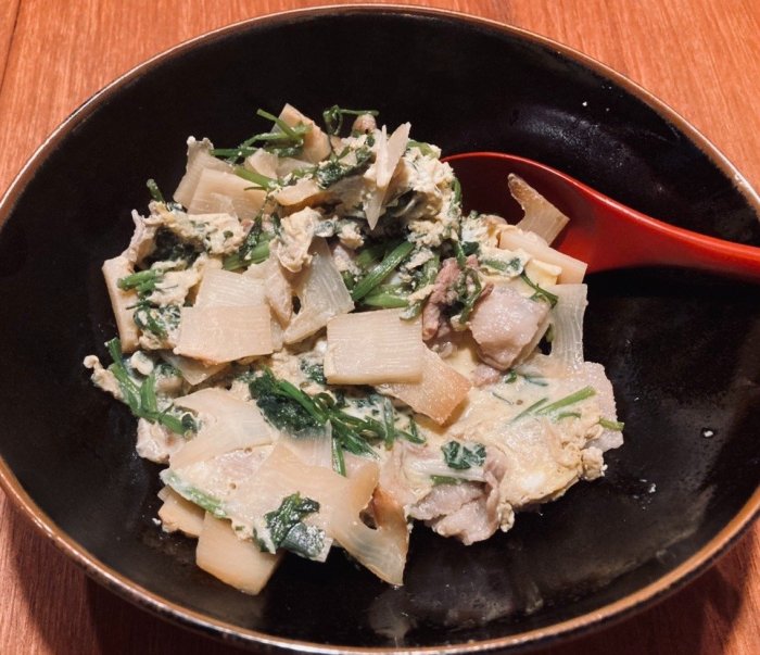 森のお母さんのセリレシピ、筍と豚の卵とじ。