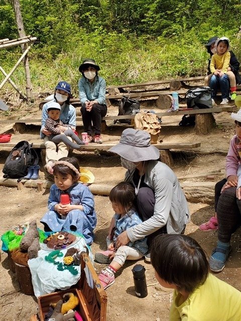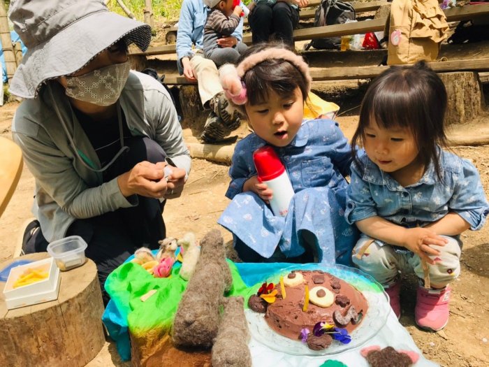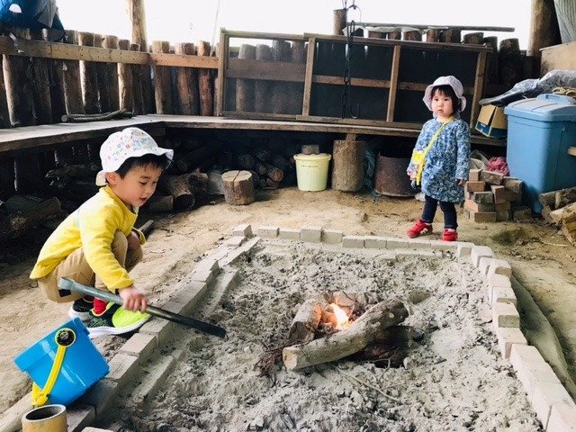 まずはいつもの火おこし。ママがおこした火を見守っています。