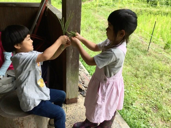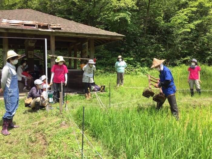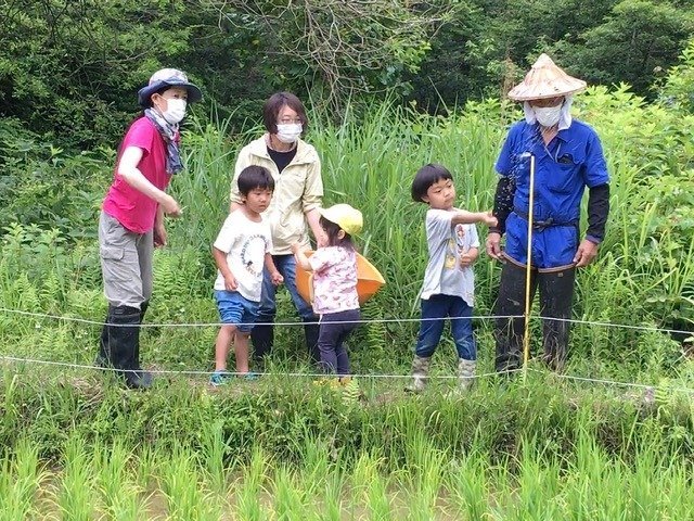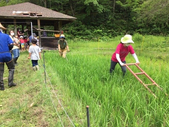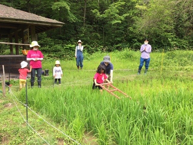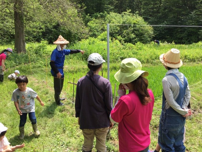 5月下旬に植えた稲も、大人の膝下ぐらいまで伸びており、今日は、砂田さんに田んぼの草取りについて教えていただきました。