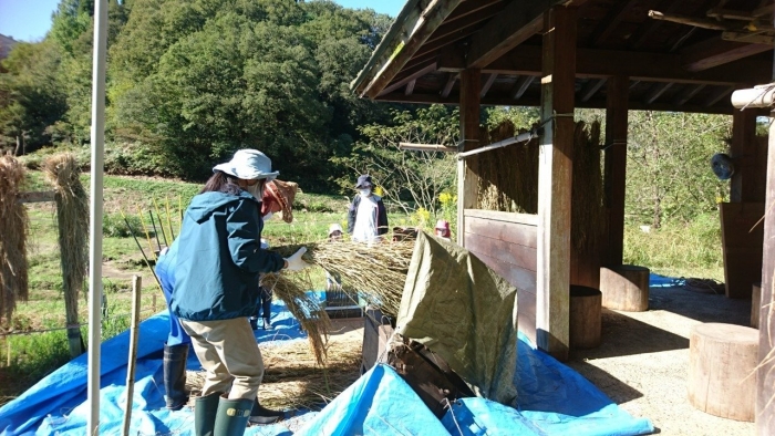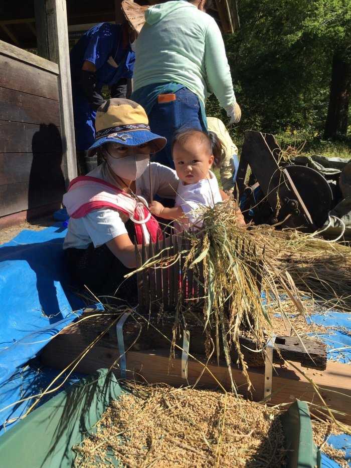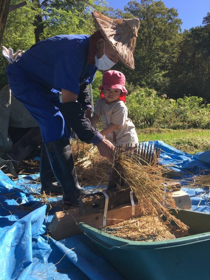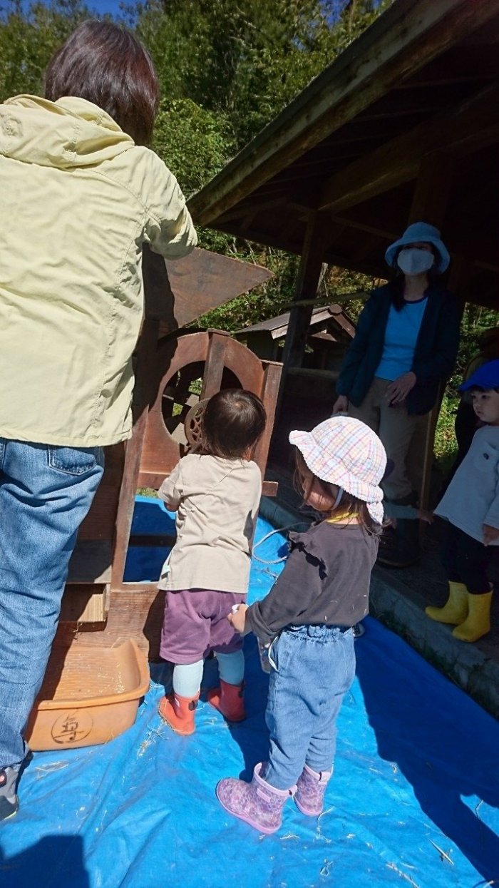 2021年10月15日(金) 森のようちえん 脱穀 先月みんなで稲刈りした稲。 すっかり干されて、 次の作業を待っている。 お天気との兼ね合いで、 金曜日の脱穀となりました。 お兄ちゃんお姉ちゃんたちは、 幼稚園や保育園。 ちびっここびとさんたち、 とっても頑張ってくれましたよ。 お天気と相談したり、 からだを動かしたり、 お米一粒一粒のありがたみが、 とてもよく分かります。 今年はみんなでお餅つきできるといいな。