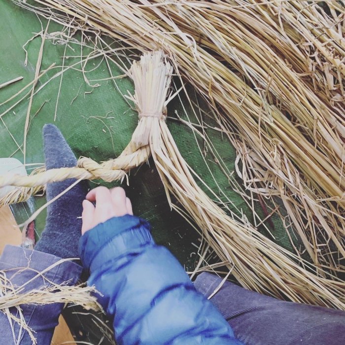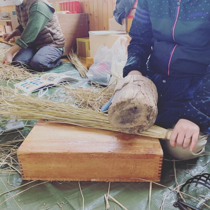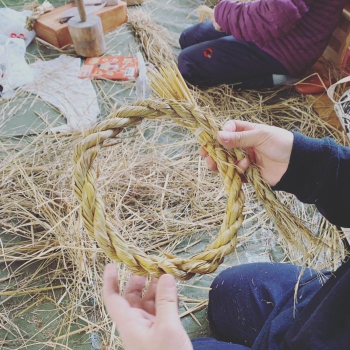 今年一年、ねいの里の田んぼで、子供と一緒に自分たちで、田植え、稲刈り、脱穀してきた稲藁で、しめ縄を作ります。
