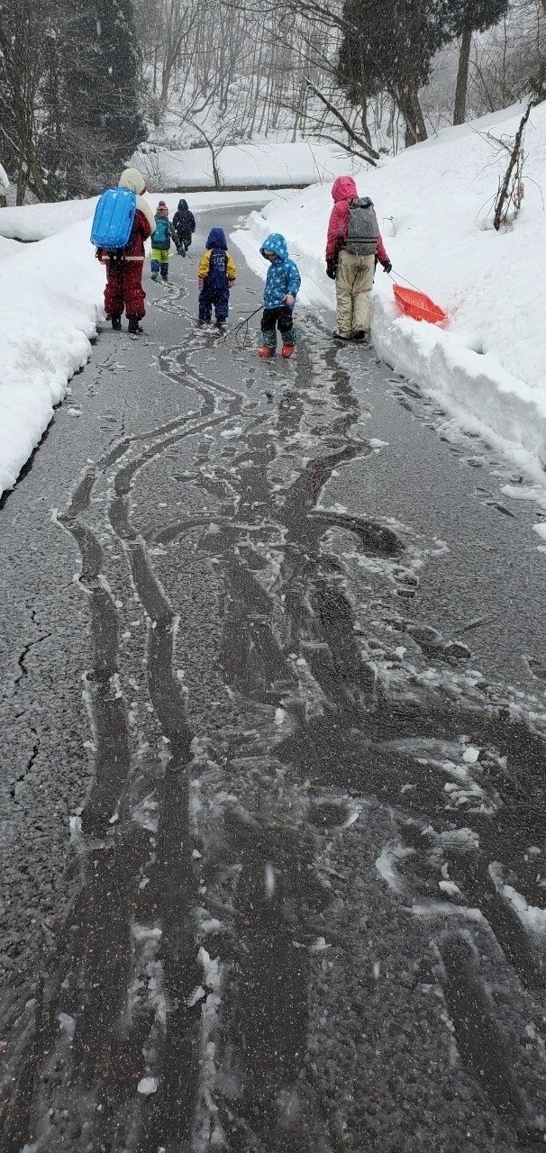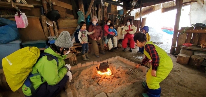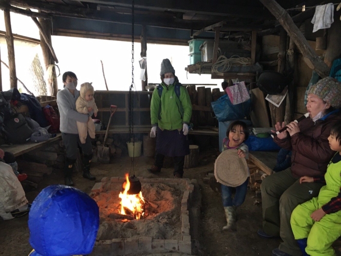 今日は大人5人、子ども5人といつもより少ない人数でした。小雪が舞う中、炭焼き小屋目指して歩きます。