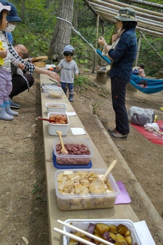 たまにこうやって、みんなが1品ずつ持ち寄る日があるのですが、コロナ対策でしばらくやめていて。それを取り戻すかのように、4月の森は、春のポットラックまつり状態です。