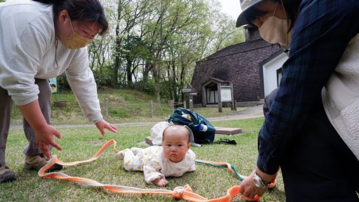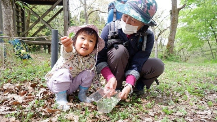 今日はみんなでよもぎ団子を作るので、よもぎの新芽を探しながらお散歩です。