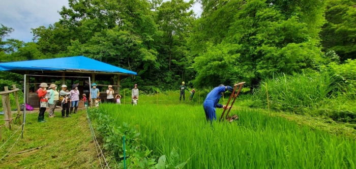 昔の草刈り機の道具ラチウチの使い、プロに伝授していただきましたが、そこまで生えてないねって事で手作業でみんなで頑張りました。