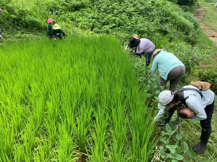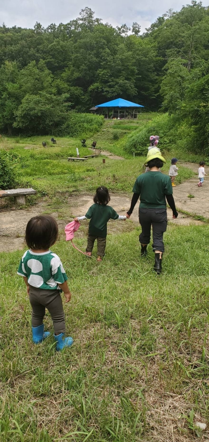再び梅雨戻りしたかの様な週でしたね。今週は森のこども園で大切に育てているもち米の田んぼの草刈りをしました。草刈りにはありがたい曇りで少し風が心地いい天気でした。