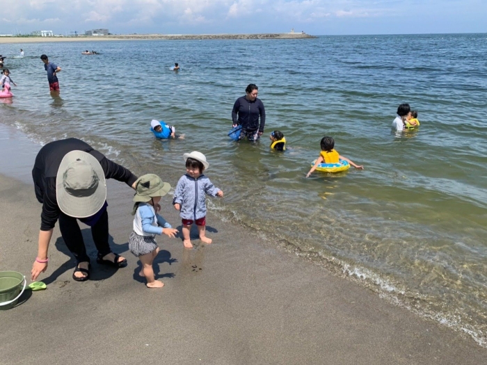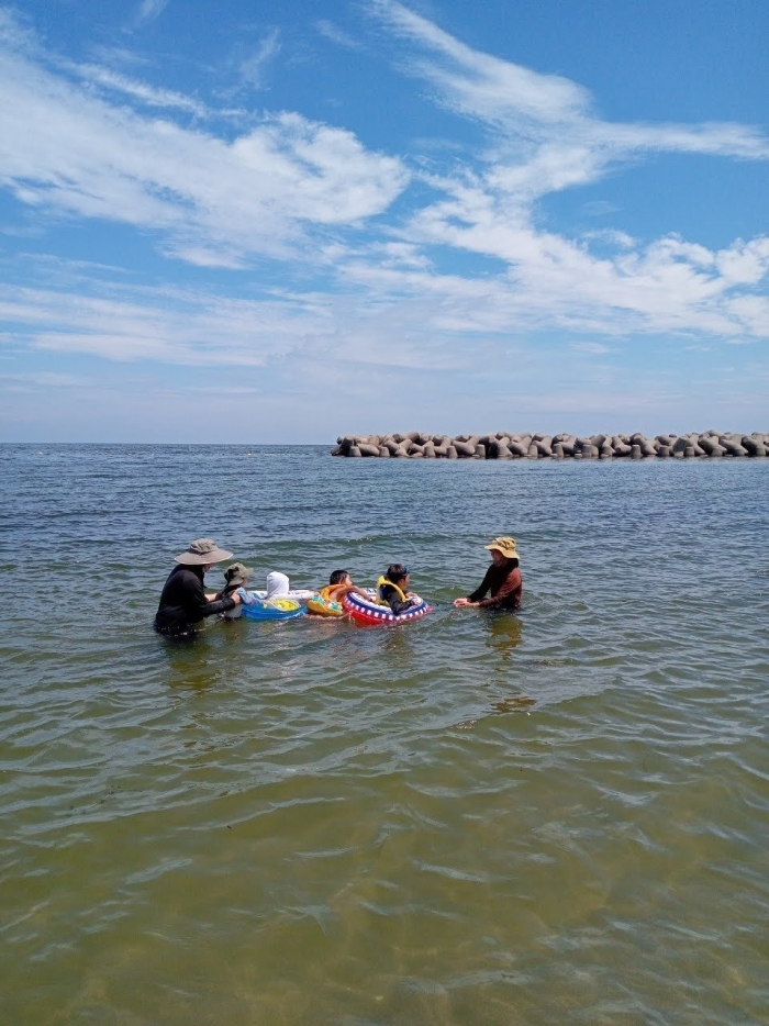 お兄ちゃんたちは、ちょっと沖までバシャバシャ。母さんたちも泳ぐ。