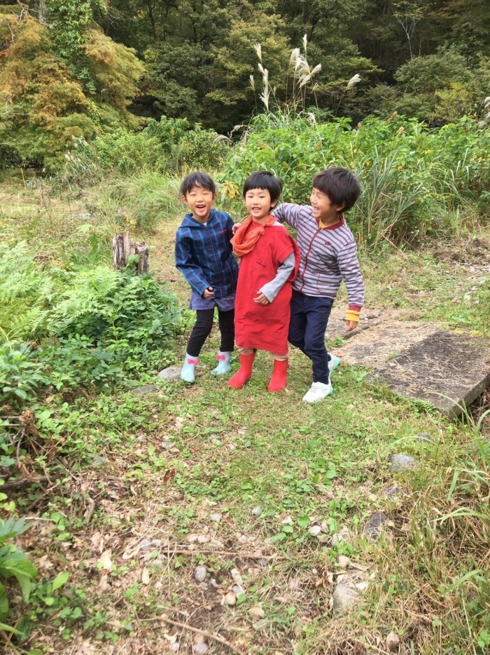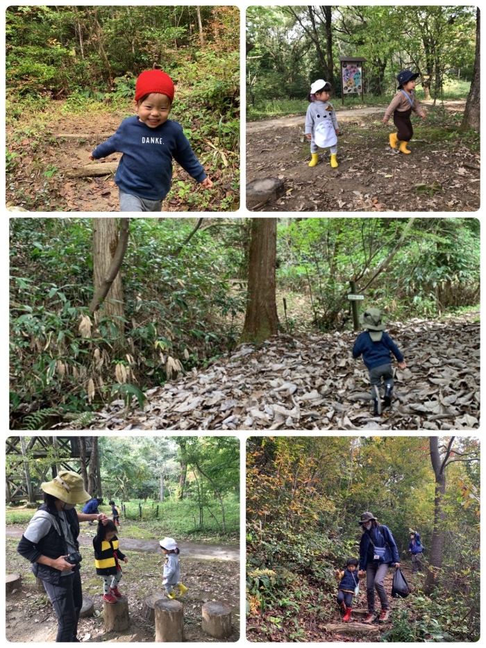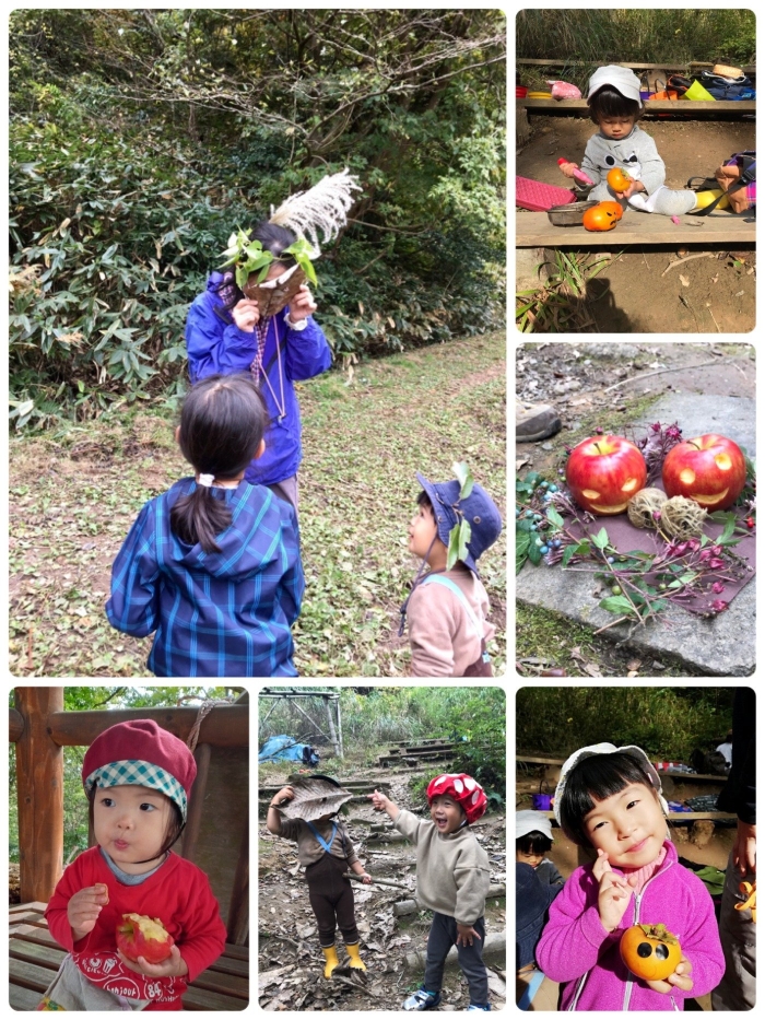 秋の森にはどんぐりや落ち葉など魅力的なものがいっぱいです。柿のジャック・オ・ランタンもつくったよ。