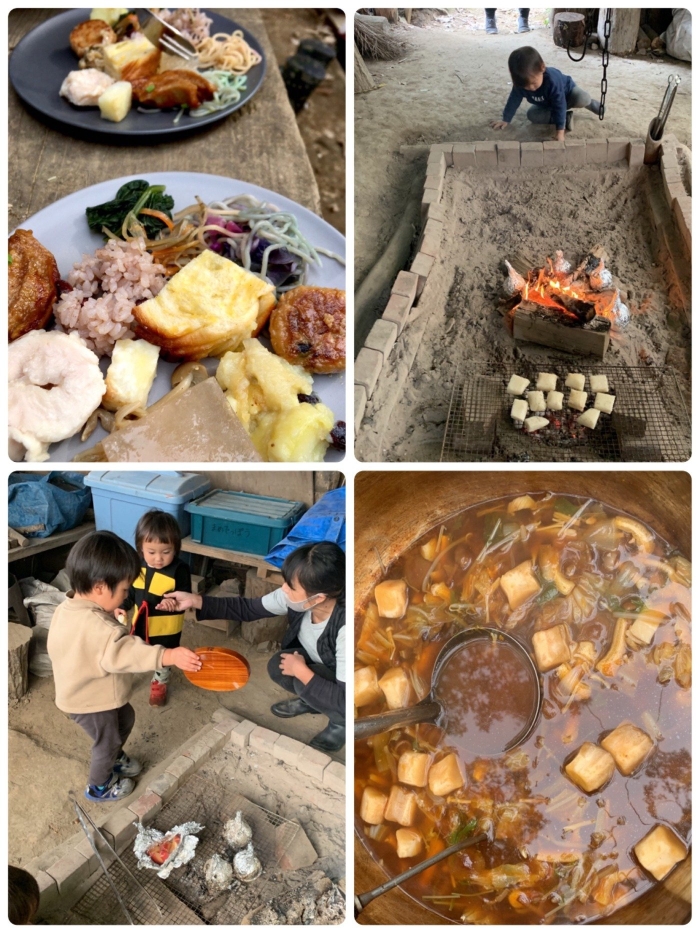お昼ごはんはカボチャの入ったお味噌汁とポットラック。囲炉裏でおもちやリンゴも焼いて、アツアツを楽しみます。お餅はみんなで育てたもち米を杵と臼でついたお餅なんですよ。
