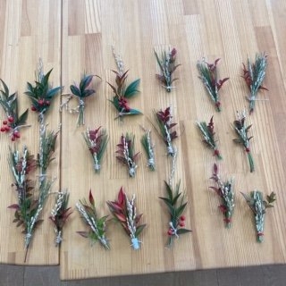 紅白の南天や松の葉、稲穂など、飾りつけの時間はみんな夢中になっていました。