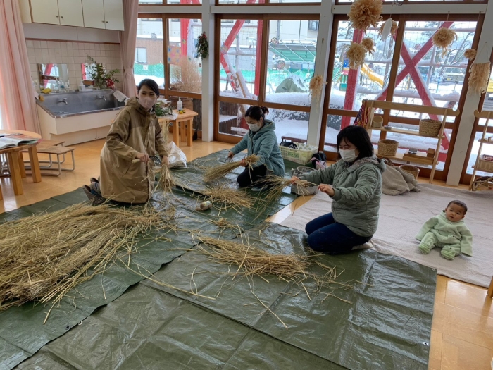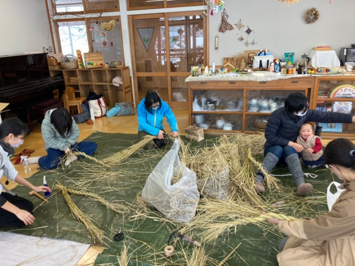 森のお母さんがしめ縄飾りの本で学んだ作り方を伝授してくれましたが、教え方がとてもわかりやすく、昨年よりも綺麗に縄を編むことができました。
