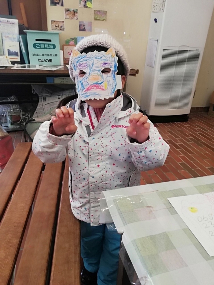 鬼のおめんもつくったよ。こんなにかわいい鬼さんが登場しました。