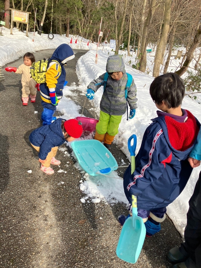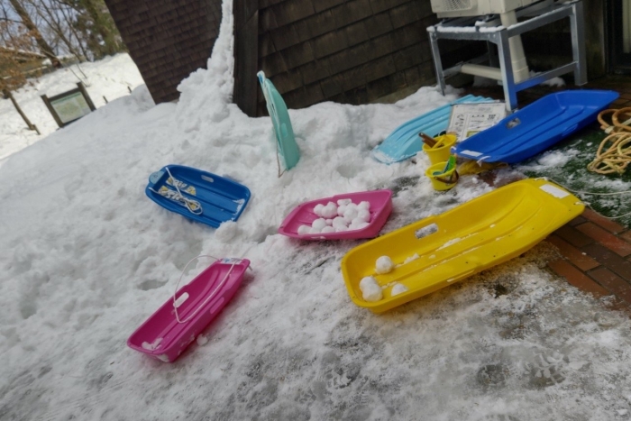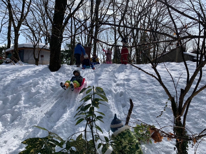雪だるまに雪合戦にそり遊び。思い思いに好きな雪遊びをします。ちょっぴりスリルのあるそり遊びが楽しめるひみつの場所があるんだって。