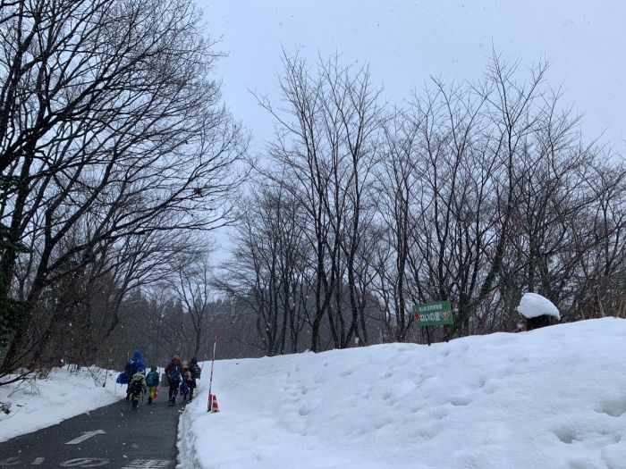 木曜日の今シーズン初の雪遊びの日。駐車場から博物館まで歩いて向かいます。雪が降る中をみんなで歩いていると、それだけでわくわくしてくるね。身体もぽかぽかです。