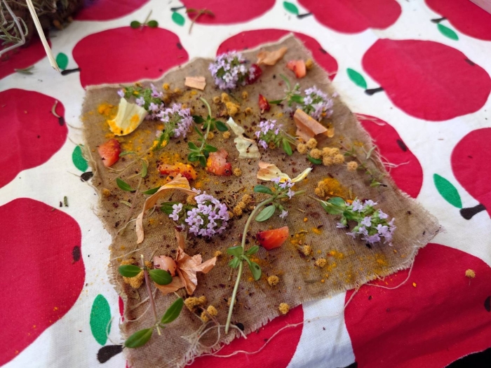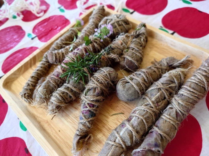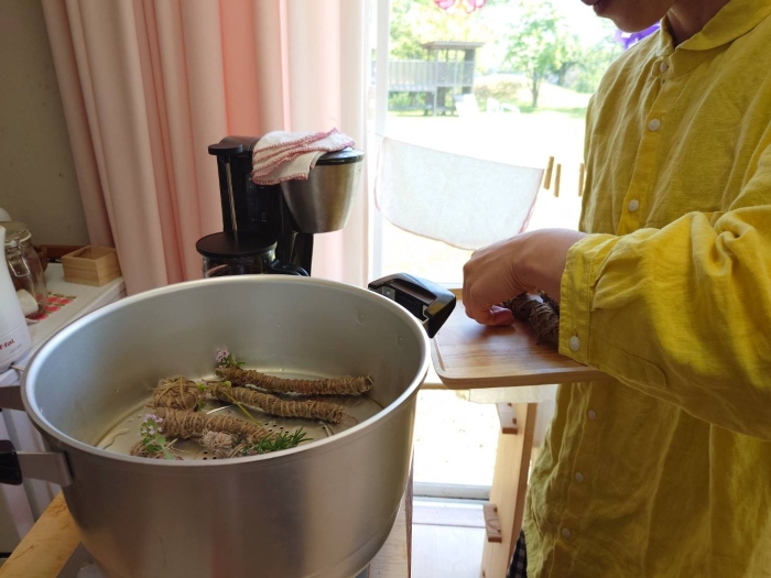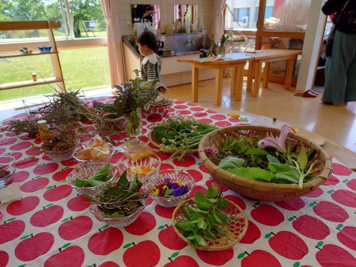 2023年05月09日(火) 森の園舎 コーヒークラッチ「バンドルダイ染め」 今日はバンドルダイという染め方で草木染めをしました。 好きな植物を布に置いて。 くるくる巻いて。 蒸します。 どんな素敵な色が移るかは。 各自。 お家へ帰ってからのお楽しみです。 蒸しているときの良い香りに、ゆるゆるリラックスできました。