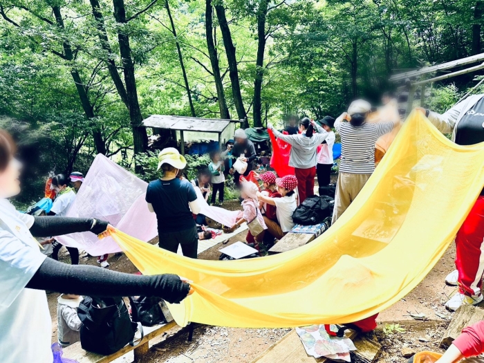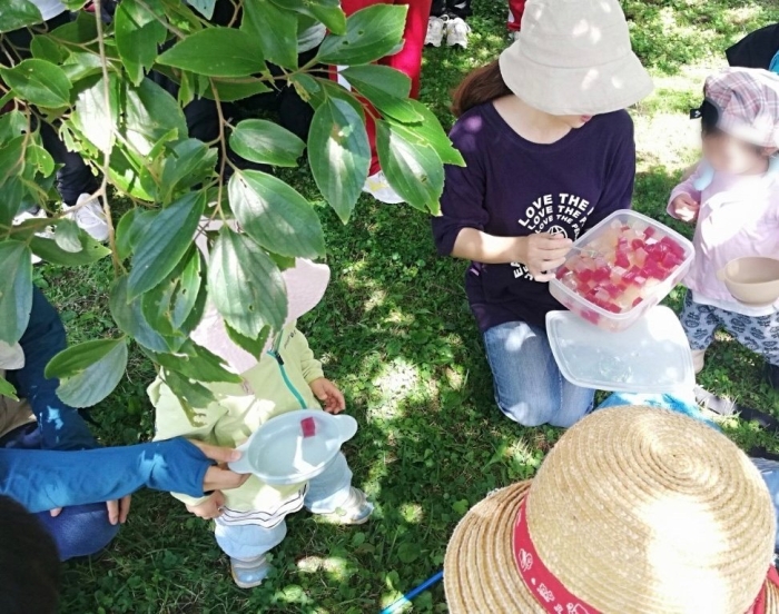 お昼ごはんの後は学生さんたちが手遊びを披露してくれたり、絵本を読んでくれたり、布で虹を作って歌を歌ってくれたり。