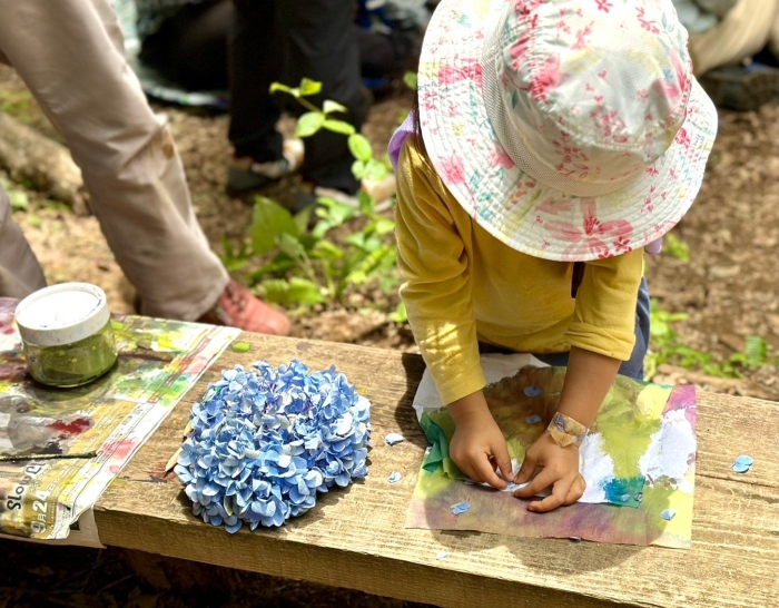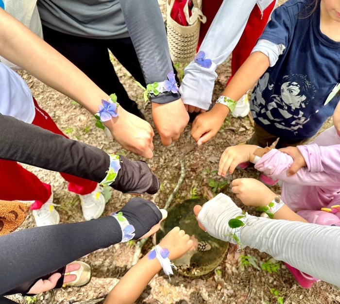 紫陽花のような色のおやつのゼリーを食べたあと、道草ブレスレットを作りながらみんなでお散歩。