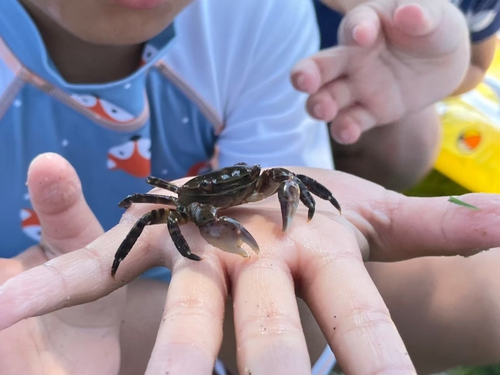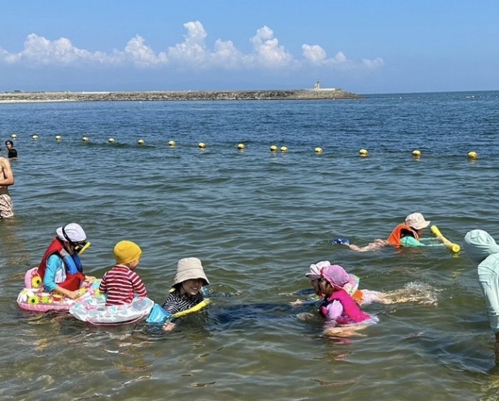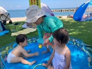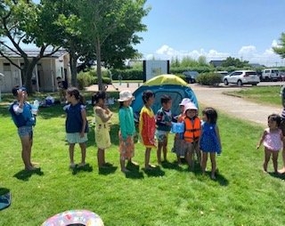 2023年07月27日(木) 森のようちえん 海老江海水浴 夏休み始まりましたー 毎年恒例の海老江海水浴場へ。 卒園児のお兄さんお姉さんたちもあそびに来てくれました。 暑さの心配がありましたが、木陰がたくさんあり、海から吹く風が心地よい日でした。 お楽しみのスイカ割り。 小さい子から順番にしようか?と言うと、きれいに背の順に並んでいて。この写真がお気に入りです♩ (Uちゃん母さん)
